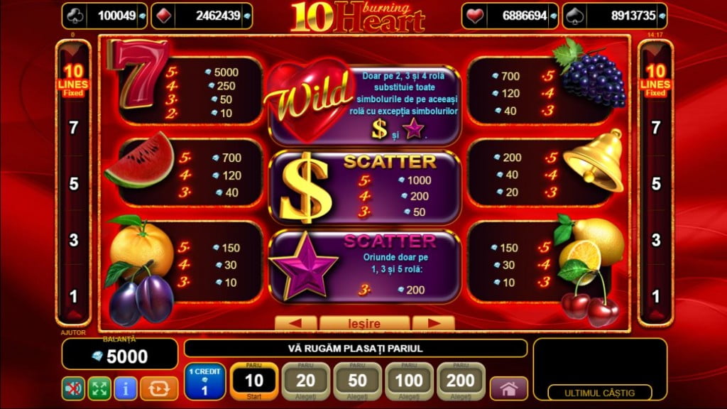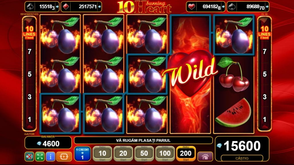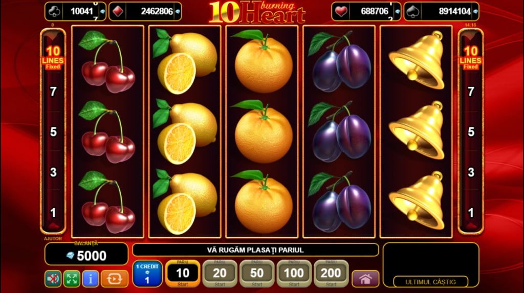 Burning Heart e destul de popular printre jocurile EGT și inima aprinsă e un simbol bine cunoscut, care te ajută să încasezi sume foarte mari. Acum vorbim de varianta cu 10 linii de plată, fiind și acest joc în mai multe versiuni.