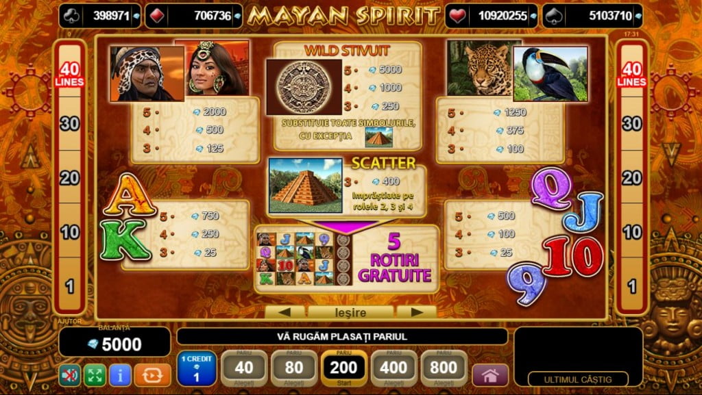 Îmi pare rău că Mayan Spirit nu-i atât de popular ca alte jocuri EGT, pentru că mie-mi place foarte mult. Poate și pentru că am o slăbiciune pentru sloturile inspirate din istorie sau mitologie. Cu sau fără slăbiciunea mea, aparatul e foarte bine făcut, banii intră des în cont, sper să vă placă și vouă.