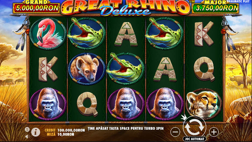 Am lăudat foarte mult jocul original Great Rhino pentru că ai niște câștiguri foarte, foarte mari la el. Versiunea Deluxe nu vine cu schimbări majore – grafica seamănă, simbolurile au o singură modificare (se renunță la cel mai slab simbol, J-ul, și apare gorila în locul lui); iar la rotirile gratuite ai o „colecție” de rinoceri în loc de 2 wild-uri (o să explic mai jos ce faci cu rinocerii în timpul lor).