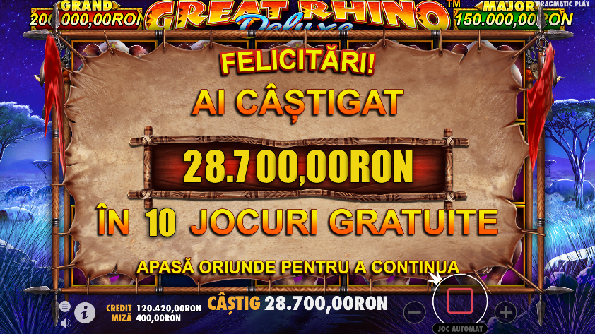 Mega câștiguri vin la jocurile gratuite și la jocurile speciale. Rotirile Gratuite se activează la 3 Scatter-uri pe coloanele din mijloc și, din păcate, nu pot fi redeclanșate – limita e de 10. În timpul lor, orice rinocer apare e „păstrat” și este readus pe ecran când se încheie jocurile gratuite. Practic, strângi cel mai valoros simbol în timpul rotirilor gratuite și la finalul lor el apare pe ecran și plătește din nou.