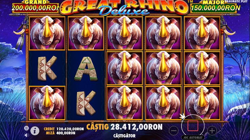 Great Rhino Deluxe e un upgrade al jocului original dar păstrează aproape tot ce l-a făcut atât de popular pe primul, inclusiv șansele uriașe de câștig. La Pragmatic apreciez foarte mult design-ul, deși eu sunt fană a sloturilor extrem de moderne, aici îmi place enorm cum combină old-school-ul ușor minimalist cu modul de joc modern și grafica lucrată bine.