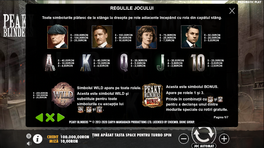 Jocul PEAKY BLINDERS poate fi jucat până sar banii din el la cazinourile online din lista de mai jos. Trebuie să reții că toate cazinourile recomandate sunt licențiate în România și vei juca 100% legal și în siguranță, dar mai mult decât atât, trebuie neapărat să ai în vedere BONUSURILE oferite de fiecare în parte la prima depunere, pentru toți jucătorii care deschid conturi noi!