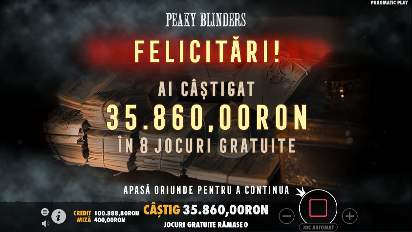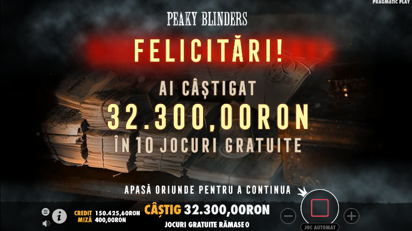 Ca și la celălalt bonus, dacă vine odată cu simbolul bonus pe coloanele 1 și 3 se declanșează Rotiri Gratuite By Order of the Peaky Blinders. Aici vei primi 10 rotiri (nici ele nu pot fi redeclanșate), toate jucate conform bonusului aferent. Dacă în jocul special ai câștiguri bune, crede-mă că în timpul rotirilor gratuite ai câștiguri uriașe.