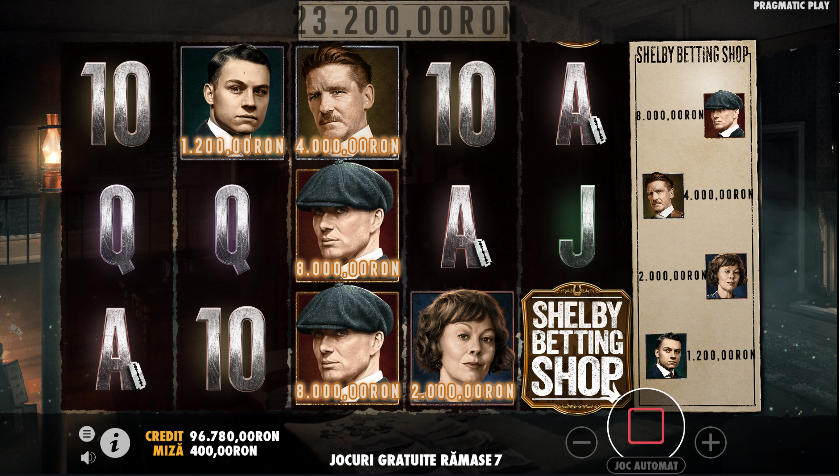 Dacă simbolul acestui bonus apare pe ultima coloană iar pe coloanele 1 și 3 sunt simbolurile Bonus, atunci ai Rotiri Gratuite Shelby Betting Shop. Sunt 8 rotiri jucate cu regulile bonusului – deci, de fiecare dată când apare simbolul bonus pe ecran și ai și personaje din serial, vei încasa sume bune. Din păcate, ele nu pot fi continuate, nu vei avea decât 8 rotiri.