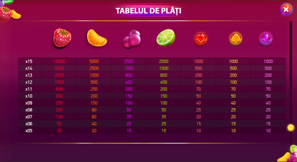 Formatul de Cluster Pays înseamnă că liniile de plată zboară pe geam. Nu mai există, nu mai contează pe ce coloană încep simbolurile. E suficient să ai 5 simboluri identice grupate, adiacente. Cu cât ai mai multe, cu atât încasezi mai bine. Maximul e la 15 zmeure – 10.000 de fise. La Berryburst-ul original, plata maximă era de 5.000.