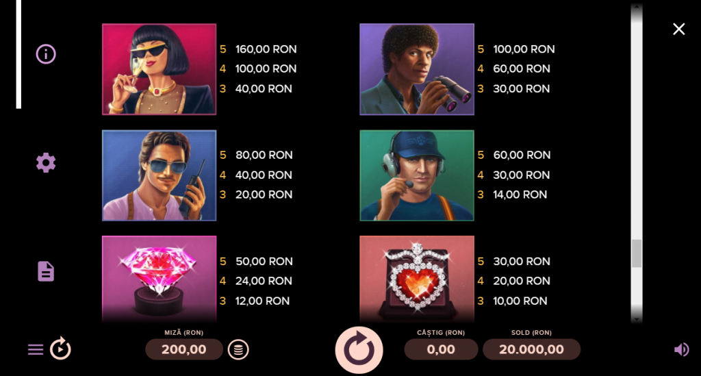 Bruneta e simbolul principal și plătește miza x8 când apare pe toată linia. Urmează cei 3 polițiști, iar restul simbolurilor (6, în total) sunt diamante.