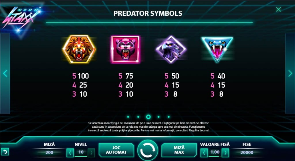 Neon Staxx combină animalele cu stilul jocurilor cu diamante pline de culori. Rar am văzut un asemenea slot, în care designul și tematica să fie atât de diferite dar să fie combinate pentru a scoate un slot video impresionant.