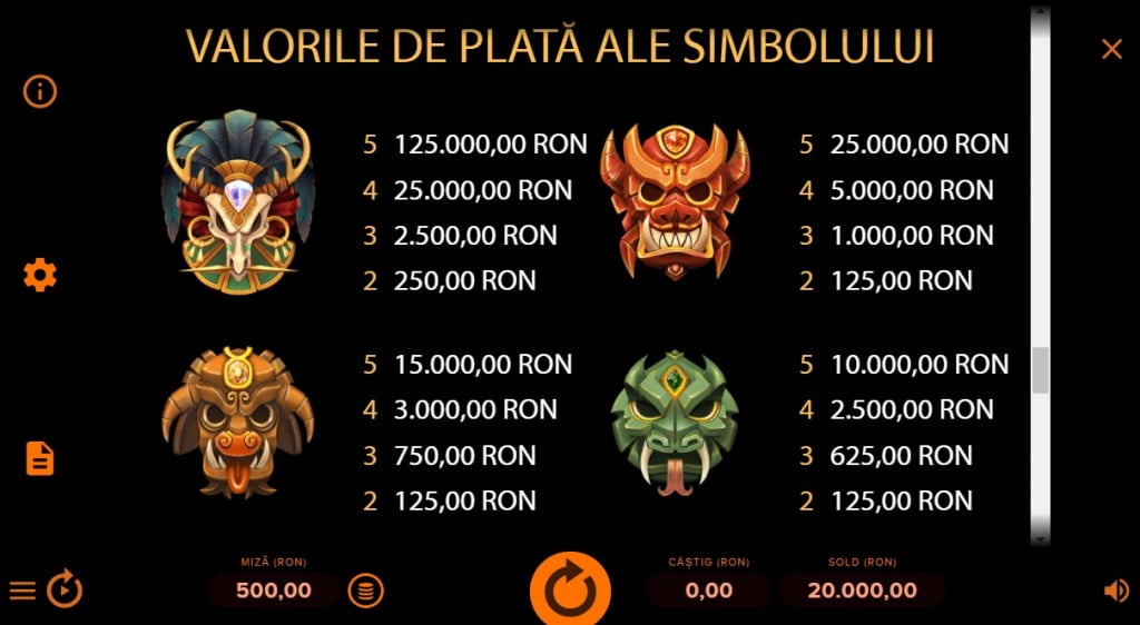 Cele 5 măști sunt simbolurile cu plată mare; cea mai valoroasă fiind cea de căpetenie, cu craniul și coarnele. Plătește de 500 ori miza dacă apare pe toată linia! După măști avem 5 cărți de joc, de la 10 la A.