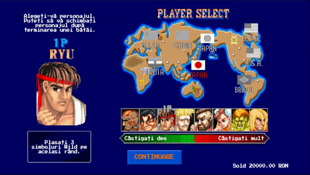 Eu n-am jucat Street Fighter, că eram prea mică în perioada lui de glorie (în schimb eram bună la Mortal Kombat). Verișorii mei mai mari, în schimb, erau înnebuniți după el și nu le-a venit să creadă când le-am spus că există acum și un joc de aparate inspirat de acolo. Grafica e 2D, e ultra-anii 90, exact ca în Street Fighter – să nu vă așteptați la ceva care să vă dea pe spate, nu asta își propune jocul. Respectă ceea ce a reprezentat jocul într-un mod senzațional. Cel mai tare e că, atunci când îl deschizi, poți alege personajul tău. Hai să vă spun ce specială are fiecare personaj, ca să vă fie ușor să alegeți. Îi scriu în ordinea în care-s trecuți de joc, de la cei cu care câștigi cel mai des până la cei cu câștiguri mai rare dar mari.