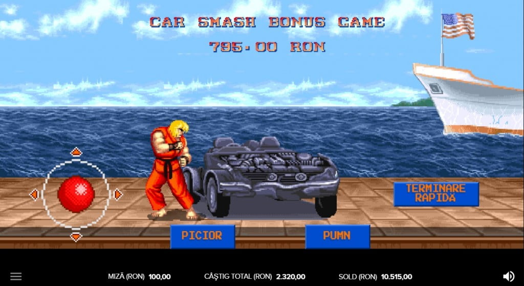 Tot ce am vorbit până acum se întâmplă în cazul în care tu câștigi primul meci, din jocul obișnuit. Dacă îl pierzi, mergi în celălalt bonus: Car Smash Bonus Game. Preiei controlul personajului prin anumite taste și trebuie să distrugi o mașină. În momentul în care mașina are daună totală primești un bonus, ales aleatoriu, între miza x5 și miza x15.