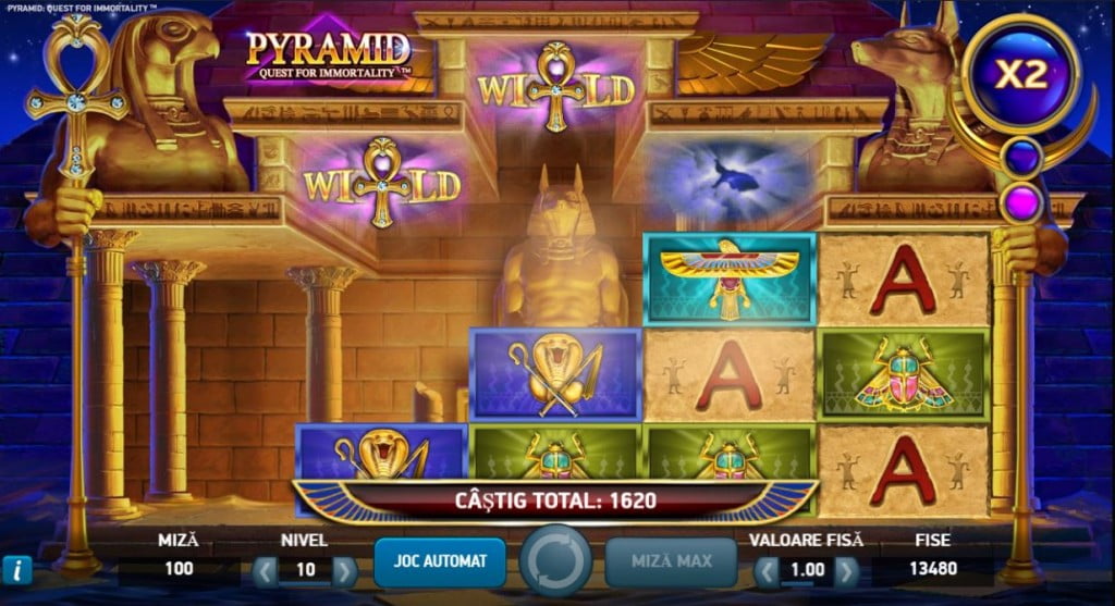 Jocurile egiptene sunt unele din cele mai populare păcănele existente și aproape orice furnizor are un slot cu tematica asta în top. NetEnt propune Pyramid: Quest for Immortality și reușește să iasă în evidență prin câteva lucruri simple, dar foarte bune pentru noi, jucătorii. Formatul liniilor e All Ways – orice combinație de simboluri aflate pe coloane alăturate, începând cu prima din stânga, e una câștigătoare. Așa se ajunge la 720 de linii de plată. Mai sunt astfel de jocuri (cel mai cunoscut e Buffalo Blitz), dar sunt destul de rare. Mie îmi place foarte mult și cum au gândit apariția Wild-ului și a multiplicatorului, voi detalia puțin mai jos.
