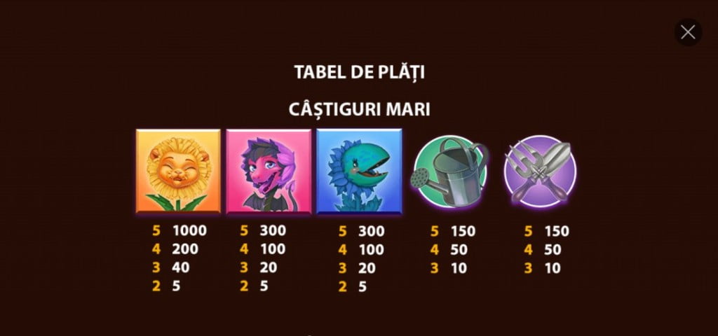 Păpădia plătește miza x40, apoi sunt celelalte două flori: gura leului și planta carnivoră. Alte două simboluri cu plăți bune sunt stropitoarea și furculița pentru grădină, iar cele mici sunt cărțile de joc, de la 10 la A.