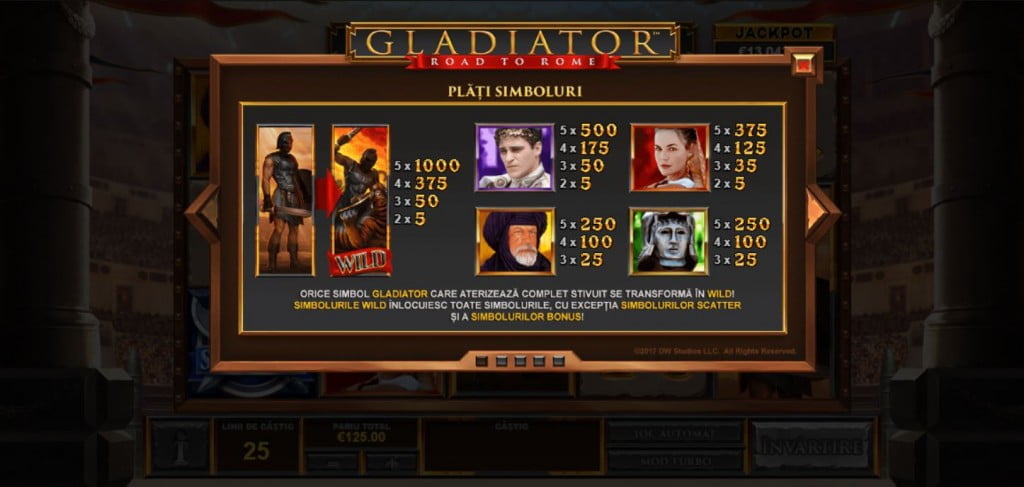 Commodus (împăratul jucat de Joaquin Phoenix) e cel mai bun simbol obișnuit, plătește miza x20. Urmează Lucilla (sora lui), Proximo („patronul” gladiatorilor) și gladiatorul cu mască de tigru. Restul simbolurilor sunt cărți de joc, de la 9 la A.