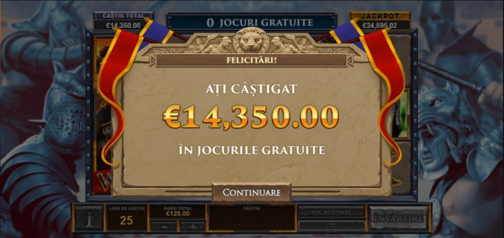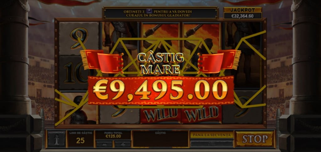 Aici am avut printre cele mai mari câștiguri în modul obișnuit de joc la aparatele PlayTech. Gladiatorul apare stivuit de foarte multe ori și se transformă în Wild, aducând niște sume frumoase de tot în cont.