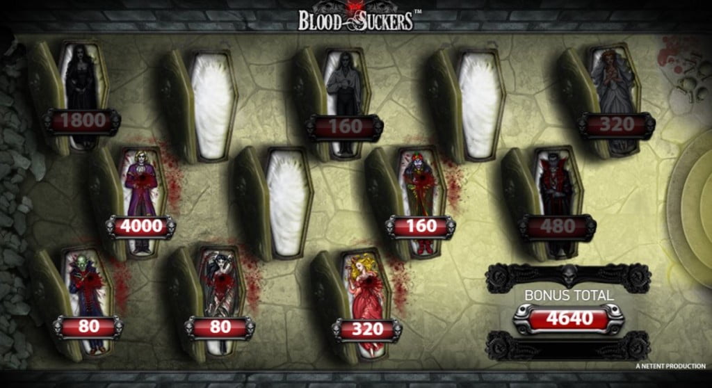 Jocul BONUS pornește când 3 simboluri Bonus sunt pe ecran, de la stânga la dreapta, pe linia de plată. Nu are și rol de Scatter, din păcate, deci dacă le ai în partea opusă a ecranului nu te ajută cu nimic. În schimb, apare des bonusul, aș zice că de 4-5 ori mai ușor de prins decât rotirile gratuite. Odată ajunși în modul bonus intrăm în camera sicrielor. Dăm click pe sicrie și descoperim ce e în ele. Dacă e un vampir, el va avea o sumă de bani care intră direct la profit. Dacă sicriul e gol, bonusul se încheie. Cel mai mare câștig posibil aici e de miza x40 la un sicriu – uriaș! Se încasează foarte bine în acest mod, niciodată n-am luat mai puțin decât miza x10, nici atunci când am nimerit doar cele mai slabe sicrie.