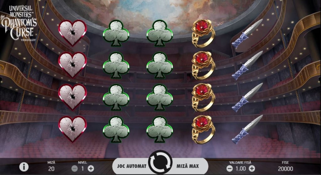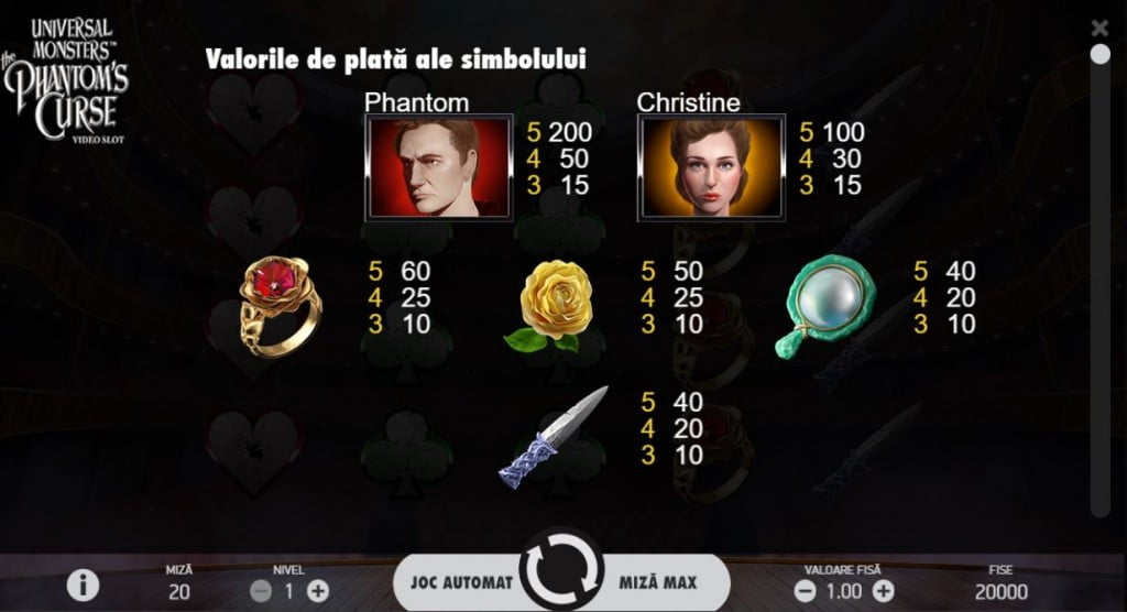 Cel mai bine plătesc Phantom și Christine, personajele principale: miza x10, respectiv miza x5. Urmează simboluri din povestea de dragoste a fantomei cu femeia: inelul, trandafirul, oglina și cuțitul. Restul au plăți mici, fiind simbolurile cărților de joc (inima roșie, inima neagră, trefla și caroul).
