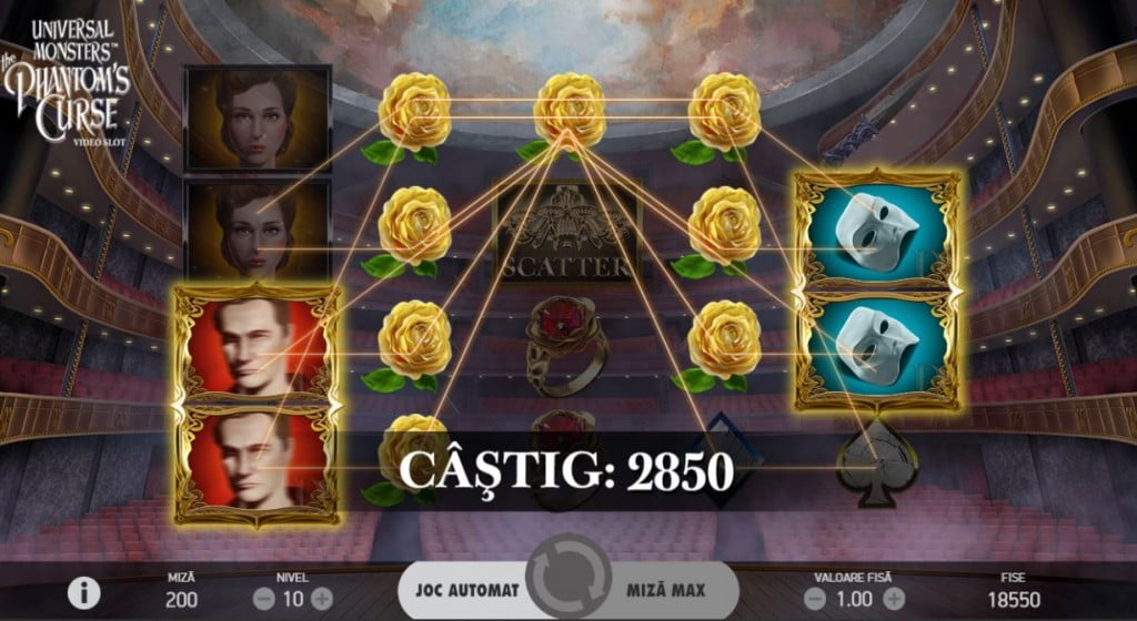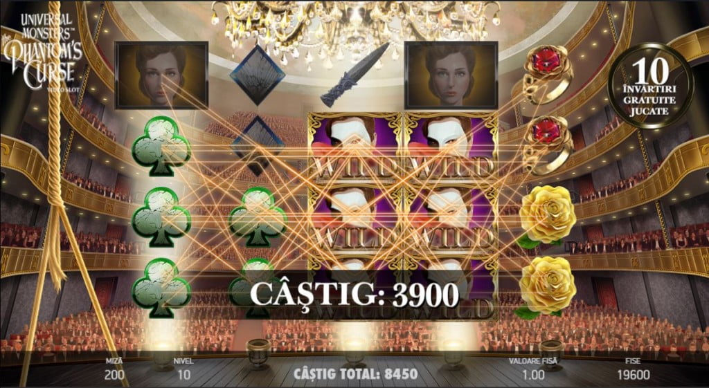 Sunt mai multe simboluri speciale în joc. Scatter-ul e candelabrul și, când apare pe coloanele impare, declanșează rotirile gratuite. Există 5 simboluri Wild, toate cu aceeași valoare (miza x10): Mask, Stacked Mask, Masked Phantom, Stacked Phantom și Stacked Christine. Toate-s Wild și pot declanșa și speciale.