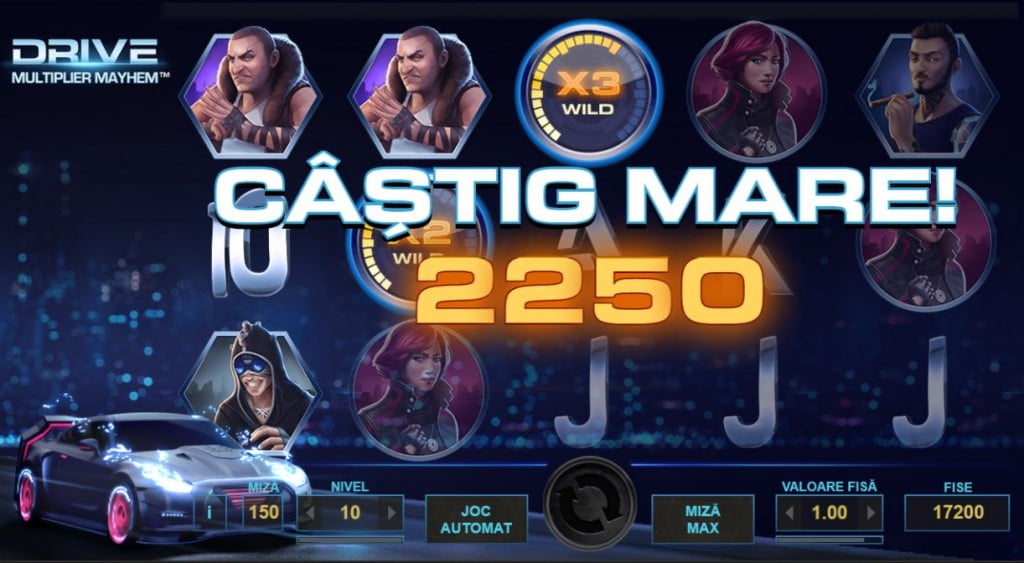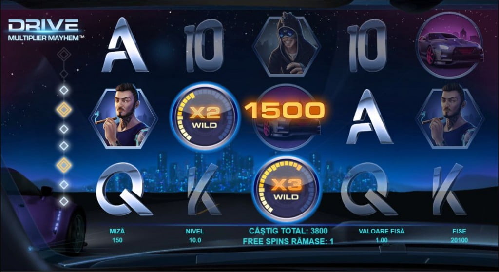 Mie mi s-au părut destul de dese câștigurile, mai ales pentru un aparat de la NetEnt – furnizor la care, de obicei, câștigi mai rar și te îmbogățești doar la speciale. Drive parcă dă bani de multe ori, iar câștigurile-s mari datorită Wild-ului Multiplier. Multiplicatorul e egal cu numărul coloanei pe care apare Wild-ul. De exemplu, un Wild pe coloana 2 îți dublează câștigul liniei, iar unul aflat pe coloana 5 îl înmulțește cu 5. Două Wild-uri pe aceeași linie de plată se înmulțesc și apoi multiplică plata liniei.