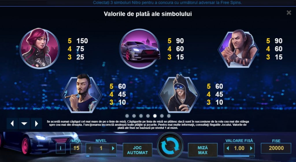 Câștiguri mari ai și la bonus. 3 simboluri Scatter pe coloanele din mijloc aduc 10 rotiri gratuite. Le poți prelungi, maximul fiind de 19. Depinde de cât de tare apeși pedala de Nitro.