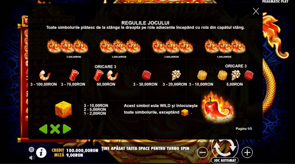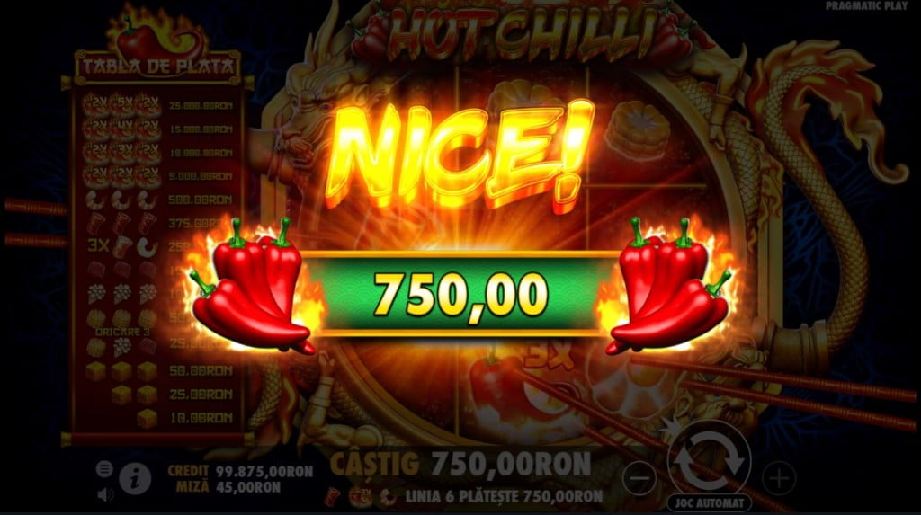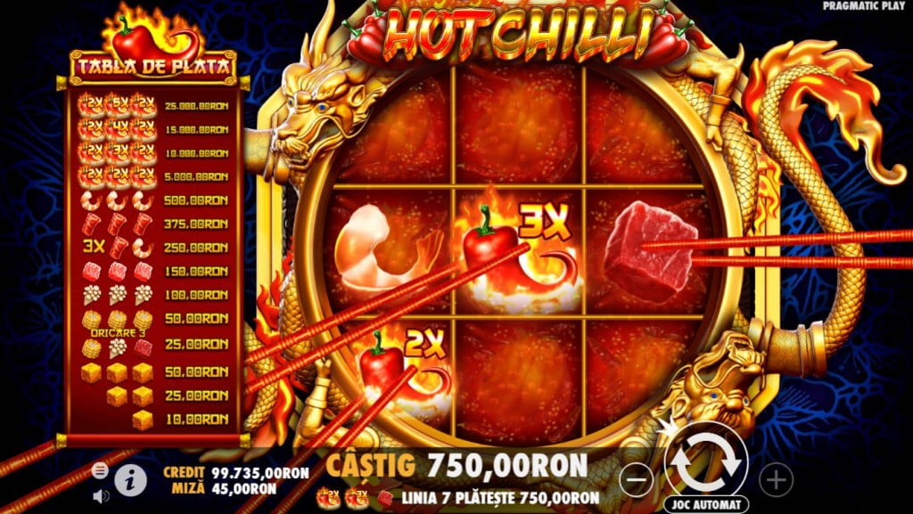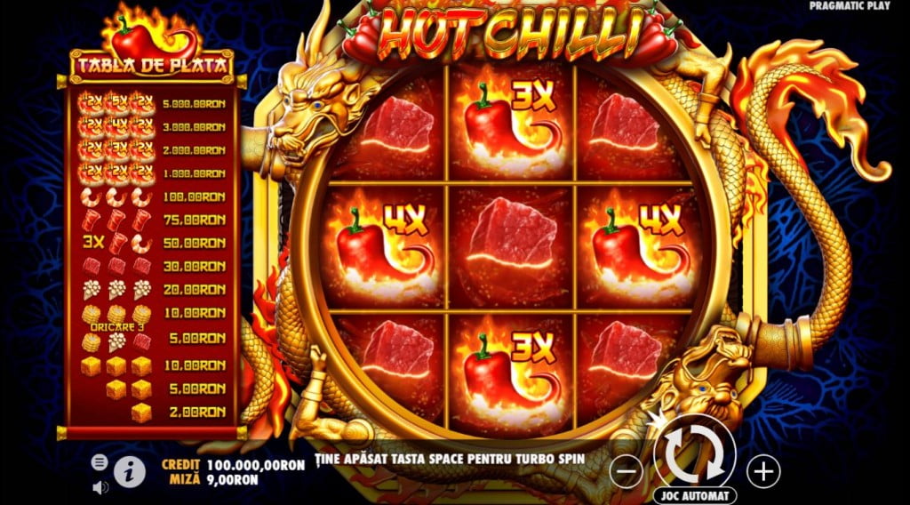 Hot Chilli e cel mai realist joc de aparate cu tema de grătar. Simbolurile nu se rotesc pe ecran. Când dai spin, se încinge grătarul și apar în unele spații bucățile de carne sau legumele. Dacă prinzi ardeii iuți, te-ai scos, sar banii din grătar.