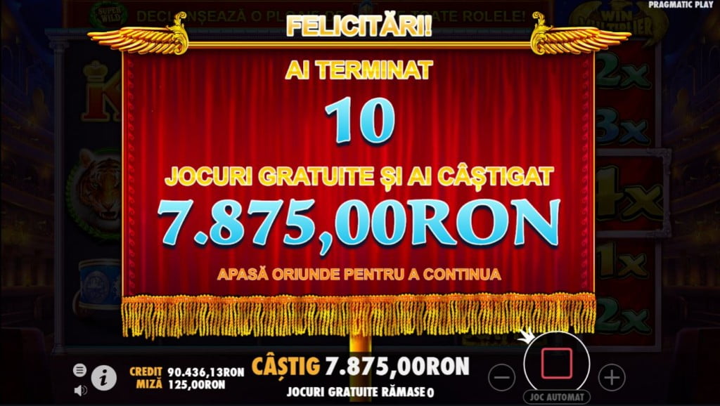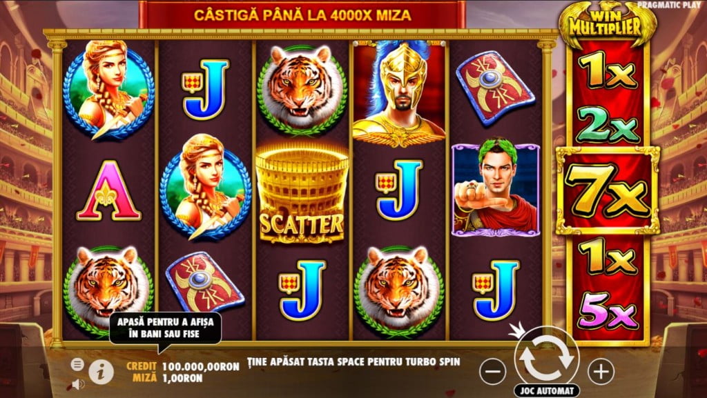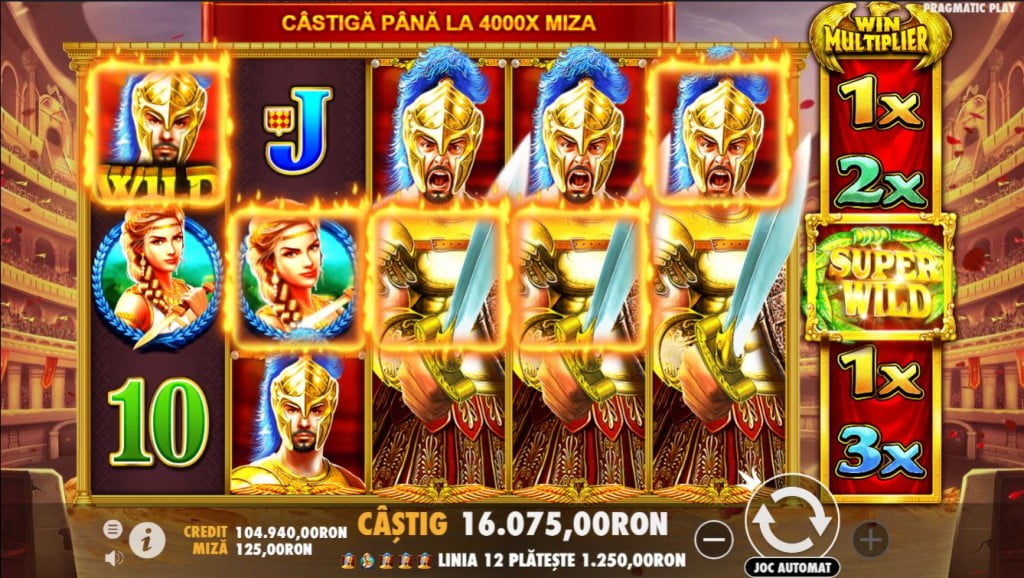 Nu-l avem nici pe Spartacus, nici pe Maximus Decimus Meridius. Dar sunt buni și gladiatorii din jocul ăsta. Băieții se bat cu tigrii și așteaptă aprobarea lui Cezar ca să ne umple pe noi de bani. Noroc că Cezar e băiat de treabă și el și ne ajută cât poate. Recunosc că îmi place mai mult Gladiator Jackpot de la PlayTech. Totuși, ăla e printre preferatele mele și-l are pe Maximus. Wild Gladiators e foarte tare, chiar l-aș pune în topul jocurilor de aparate epice sau de acțiune. Imaginea și muzica sunt super, potrivite tematicii, avem rotiri gratuite, avem un SuperWild și avem, în dreapta ecranului, bara de multiplicator care ne mărește câștigurile.