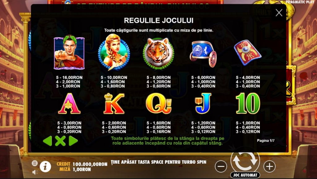 Cezar plătește cel mai mult în joc: miza x16. Urmează împărăteasa, tigrul, carul și scutul, iar restul simbolurilor sunt cărți de joc de la 10 la A.
