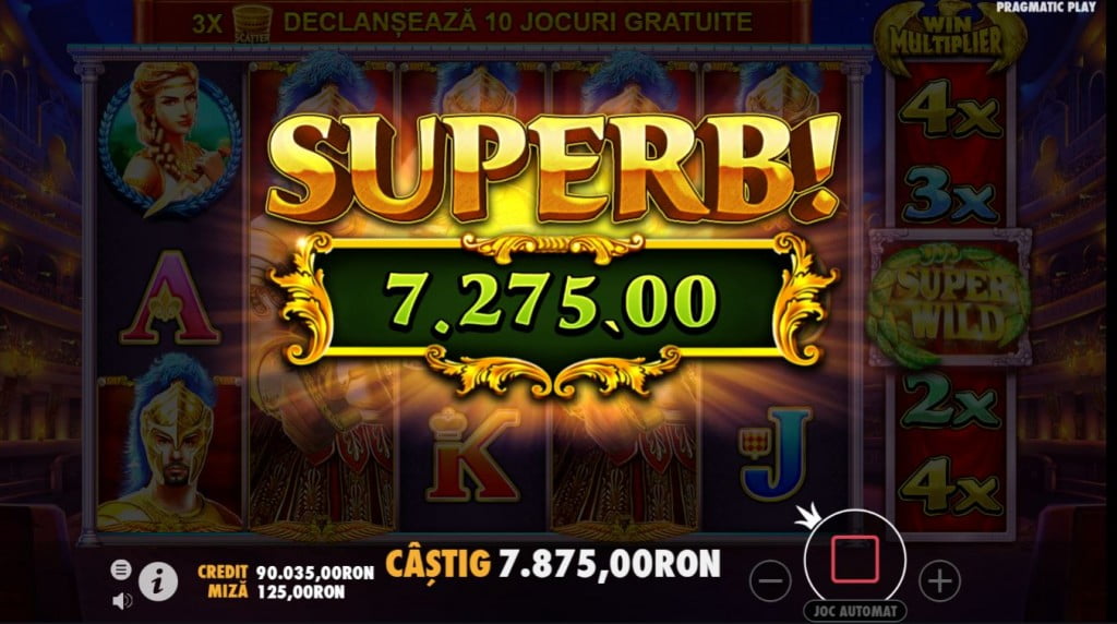 Cu Cezar, cu soția lui și cu Wild-uri. Bine, multiplicatorii de pe coloana externă sunt foarte importanți. Practic, un dublaj în care tu nu ai cum să pierzi. Dacă pe mijlocul coloanei externe apare un simbol Wild, atunci se activează bonusul SuperWild și pe fiecare rolă va fi pus, aleatoriu, un Wild. Iar Wild-urile de pe rândul din mijloc se extind pe toată coloana.