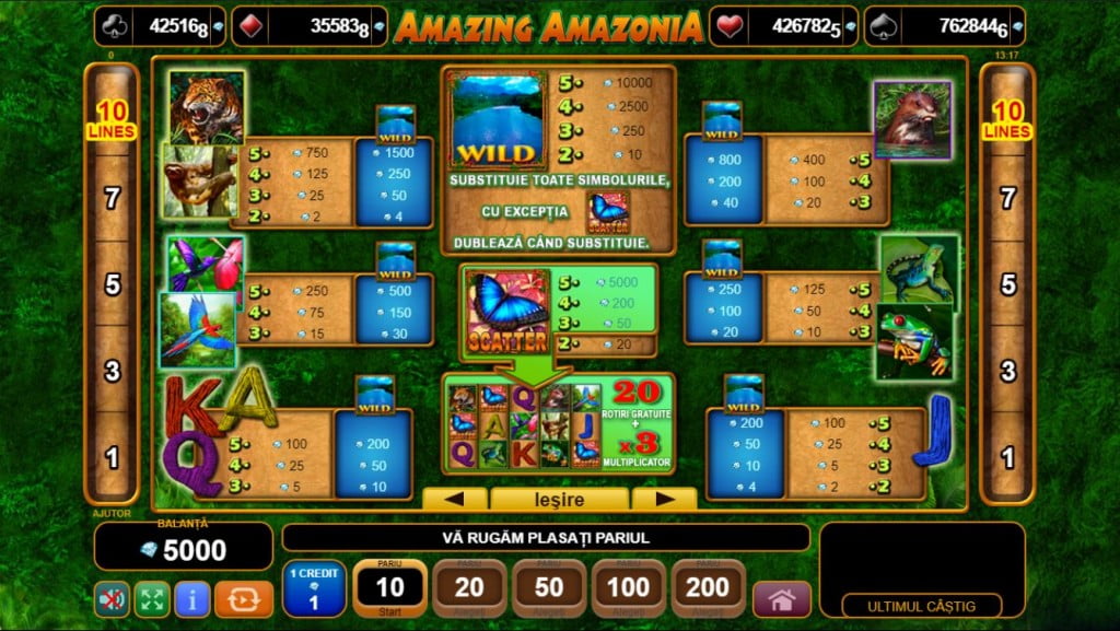 EGT-ul are mai multe jocuri cu Amazonul, ăsta e unul dintre ele. Nu prea știu cum iese în evidență. Ca grafică sau muzică, știți prea bine ce înseamnă EGT. Totul e retro. Simbolurile sunt… ok, cred. Un pic cam greu de diferențiat, dacă nu ești atent la ecran confunzi păsările sau broasca și șopârla. Modul de joc e bun. Îmi place că aproape orice joc EGT are un Wild special. Ori se extinde pe coloană, ori se mută câte un spațiu pe ecran, dă o re-rotire, multiplică profitul – cum e cazul aici. Plus rotirile gratuite, jucate cu multiplicatorul x3 activ. E bun jocul. Multe posibilități de câștig.