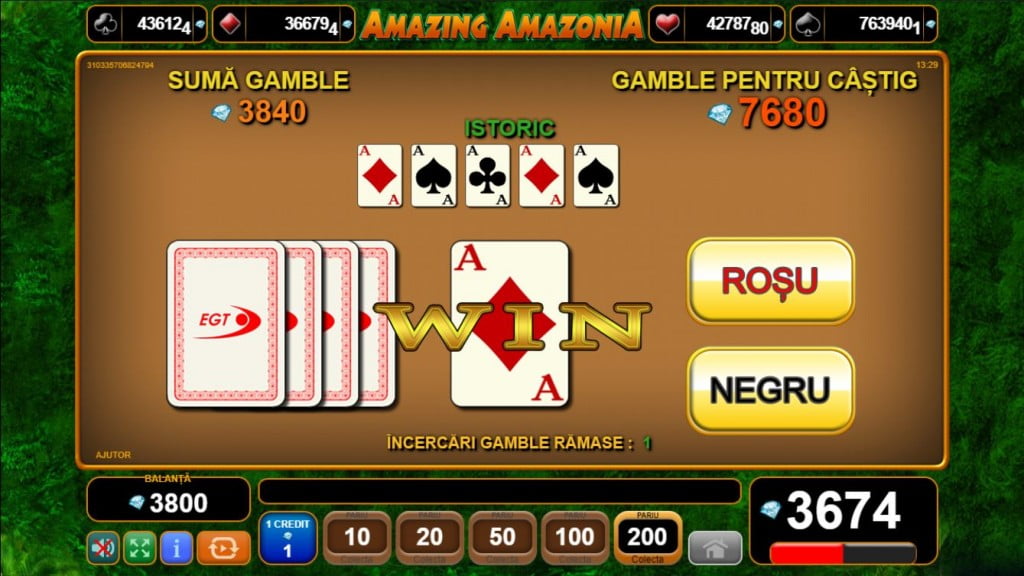 Dacă sumele pe care le încasezi nu te mulțumesc, poți merge la dublaje. E cea mai cunoscută opțiune de la EGT, „totul sau nimic”. După fiecare câștig poți alege dacă încasezi sau dacă încerci să mărești suma prin Gamble. Dacă dai Gamble, mergi în ecranul alternativ în care ai de ales culoarea așilor care se vor întoarce. Roșu sau negru. Ai nimerit culoarea, câștigul tău e dublu. Ai greșit-o, ai pierdut tot. Recomand, din nou, ce spun de fiecare dată: nu dubla absolut orice câștig. Mai ales dacă ajungi la o sumă bună. Riști să pierzi tot și să te trezești că ai pariat toți banii la un joc fără să bagi ceva în casă pentru că ai pierdut la dublaje. Când câștigul e bun, încasează-l sau dublează-l de 1-2 ori.