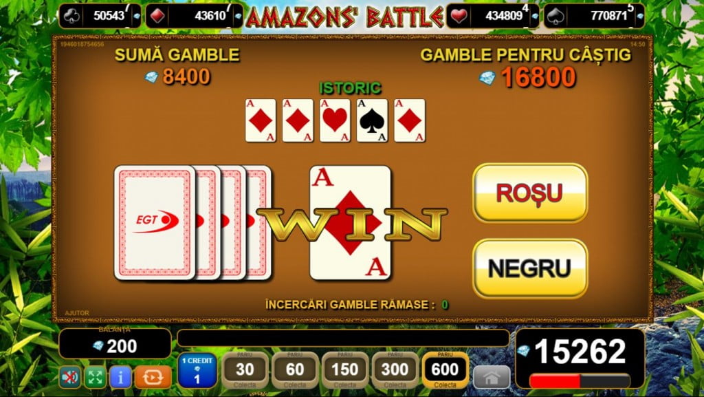 Dacă sumele pe care le încasezi nu te mulțumesc, poți merge la dublaje. E cea mai cunoscută opțiune de la EGT, „totul sau nimic”. După fiecare câștig poți alege dacă încasezi sau dacă încerci să mărești suma prin Gamble. Dacă dai Gamble, mergi în ecranul alternativ în care ai de ales culoarea așilor care se vor întoarce. Roșu sau negru. Ai nimerit culoarea, câștigul tău e dublu. Ai greșit-o, ai pierdut tot. Recomand, din nou, ce spun de fiecare dată: nu dubla absolut orice câștig. Mai ales dacă ajungi la o sumă bună. Riști să pierzi tot și să te trezești că ai pariat toți banii la un joc fără să bagi ceva în casă pentru că ai pierdut la dublaje. Când câștigul e bun, încasează-l sau dublează-l de 1-2 ori.