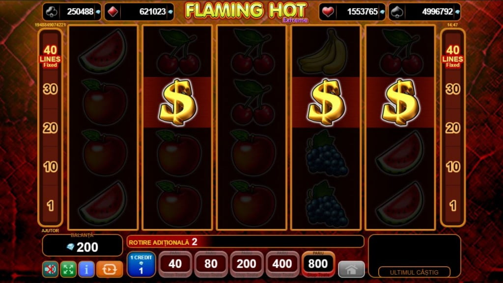 Despre originalul Flaming Hot am scris că e „drăguț, fără să fie special”. Despre Extreme pot să spun că e foarte bun. De obicei, update-urile EGT înseamnă o schimbare a liniilor de plată, cel mult mărirea ecranului din 5×3 în 5×4. La Flaming Hot Extreme, însă, apar rotirile gratuite – pe care nu le aveam la jocul original. Iar șansele ca ele să vină sunt ridicate de o semi-specială pe care aș vrea-o la orice aparat: când ai 2 simboluri Scatter pe ecran primești o re-rotire, cu cele două fiind blocate pe locurile lor.
