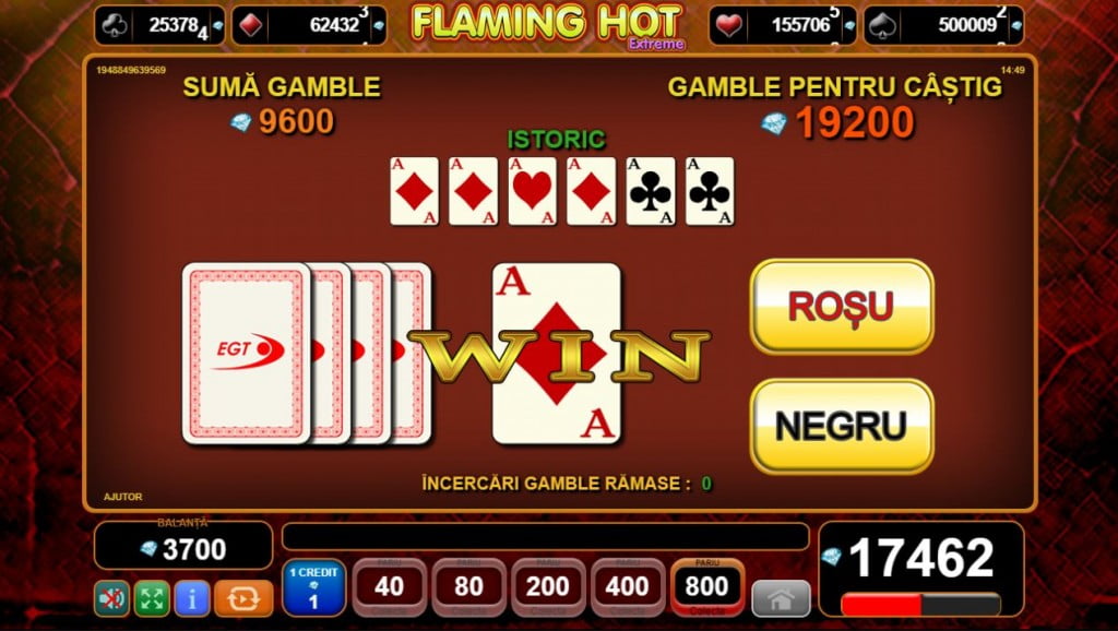 La EGT poți mări oricând un câștig cu opțiunea de dublaj. Când ai o linie câștigătoare, ai de ales dacă încasezi plata ei sau mergi pe „totul sau nimic” cu opțiunea de Gamble/Dublaj. Acolo va trebui să ghicești culoarea asului care urmează să se întoarcă (roșu sau negru). Dacă o nimerești, banii tăi din acea rotire se dublează. Dacă nu, ai pierdut tot. Dublajele sunt bune, utile, dar nu abuza de ele. Amintește-ți să mai bagi și în casă. Sunt și rotiri unde ai un câștig suficient de bun încât să nu merite să fie riscat.
