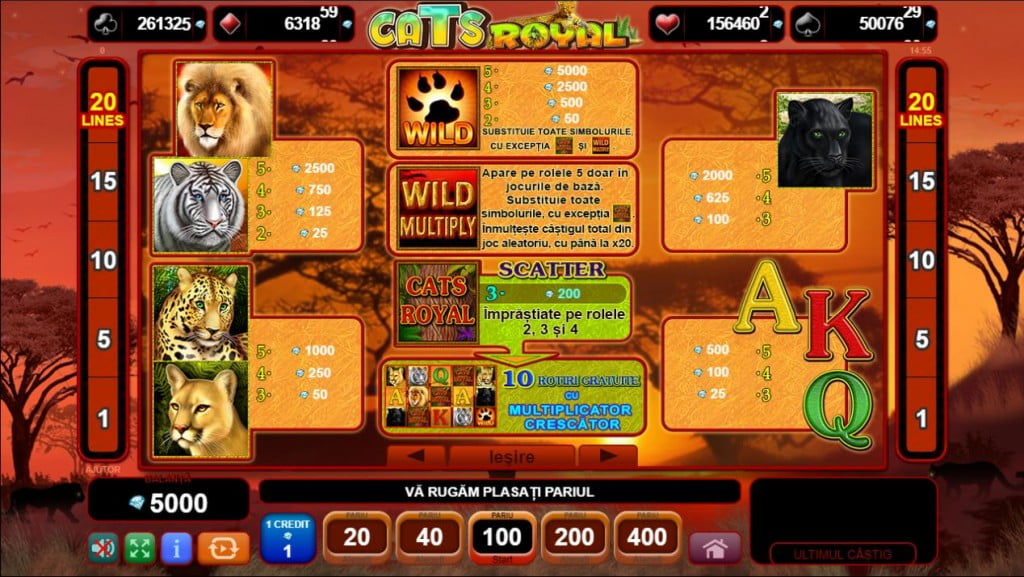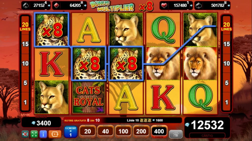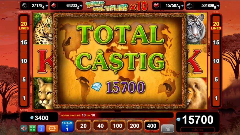Sângele albastru al marilor pisici de pradă aduce o schimbare binevenită la EGT. S-au mai… „pisicit” ei cu 100 Cats, doar că acolo erau în centrul atenției pisicile de casă. Aici e vorba de felinele mari, de regii jungelor. Și grafica e reușită, cu un fundal de safari și simboluri desenate impecabil. Păcat că nu au venit nici acum cu o muzică mai potrivită. Cred că și în 2080 tot sunetul de păcănele va fi la sloturile online EGT, sinceră să fiu. Alt aspect modern al jocului e multiplicatorul, care apare atât în jocul de bază (unde e un Wild Multiplier) dar și la rotirile gratuite, fiind un multiplicator progresiv.