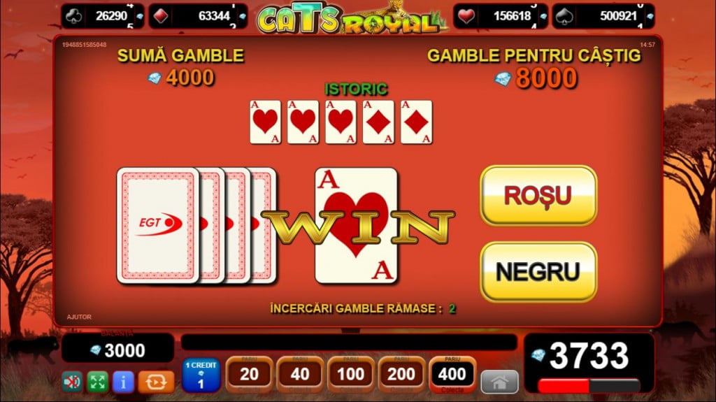 La EGT poți mări oricând un câștig cu opțiunea de dublaj. Când ai o linie câștigătoare, ai de ales dacă încasezi plata ei sau mergi pe „totul sau nimic” cu opțiunea de Gamble/Dublaj. Acolo va trebui să ghicești culoarea asului care urmează să se întoarcă (roșu sau negru). Dacă o nimerești, banii tăi din acea rotire se dublează. Dacă nu, ai pierdut tot. Dublajele sunt bune, utile, dar nu abuza de ele. Amintește-ți să mai bagi și în casă. Sunt și rotiri unde ai un câștig suficient de bun încât să nu merite să fie riscat.