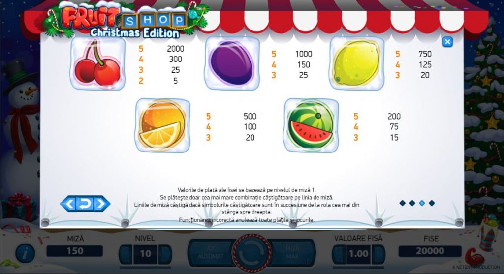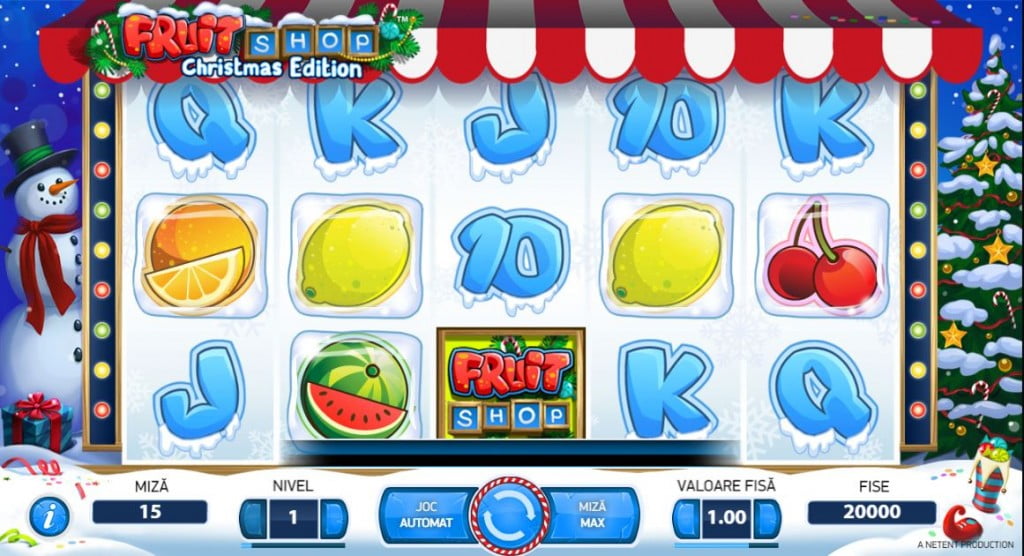 Fruit Shop-ul original e unul dintre cele mai populare sloturi NetEnt din istorie. Chiar dacă e foarte simplu pentru ce creează furnizorul de obicei, jucătorii de aparate l-au îndrăgit pentru combinația dintre fructe și mod de joc modern. Christmas Edition-ul păstrează funcționalitățile originalului dar ne duce într-o tematică de sărbători, de Crăciun. Cu oameni de zăpadă, brazi și fructe înghețate.