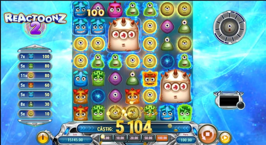 Jocul nu are liniile clasice, ci formula de Cluster Pays. Așadar, dacă ai același simbol alăturat pe 5 spații, creezi un câștig. După fiecare câștig, simbolurile care au făcut parte din Cluster cad de pe ecran și apar altele noi în locul lor.