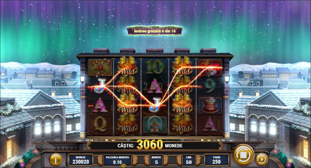 Moș Crăciun e Scatter și aduce rotirile gratuite. Cutia de cadouri e Wild și înlocuiește orice simbol.