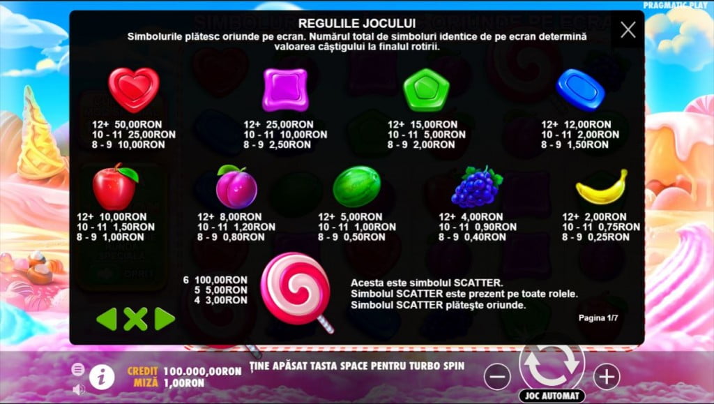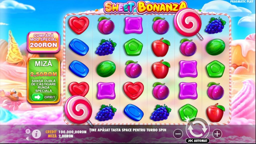 Sweet Bonanza îți dă voie să cumperi speciala, vine cu Scatter Pays și are multiplicatori uriași la rotirile gratuite. Diferit de ce jocuri cu fructe știm noi.
