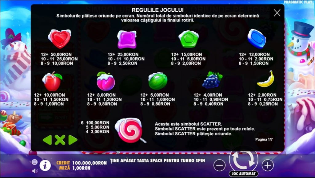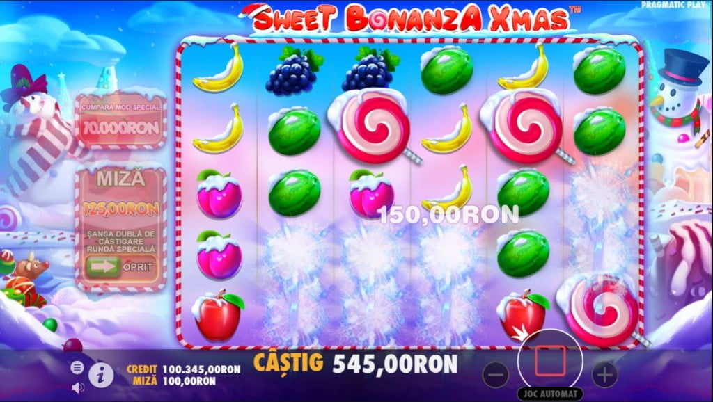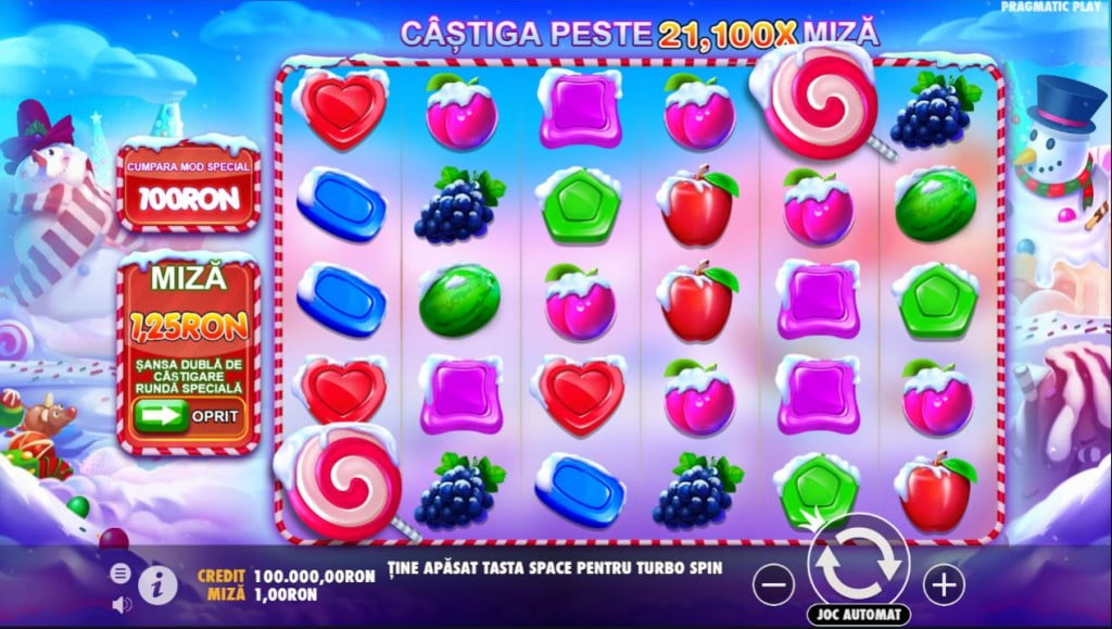 Sweet Bonanza Xmas, varianta de Crăciun de la superjocul cu fructe făcut de Pragmatic Play. Cumperi speciala, Scatter Pays și multe altele!