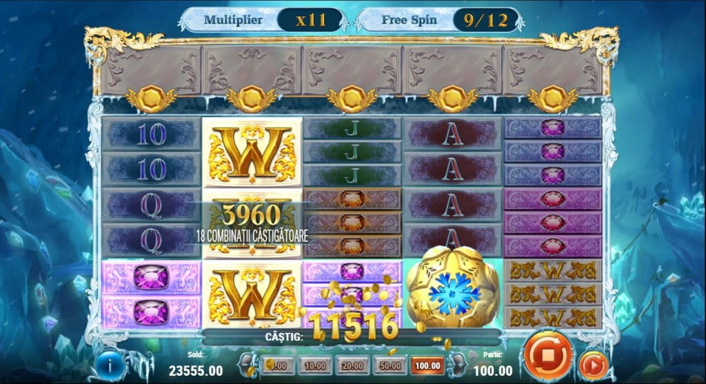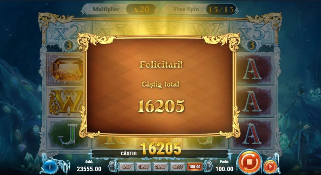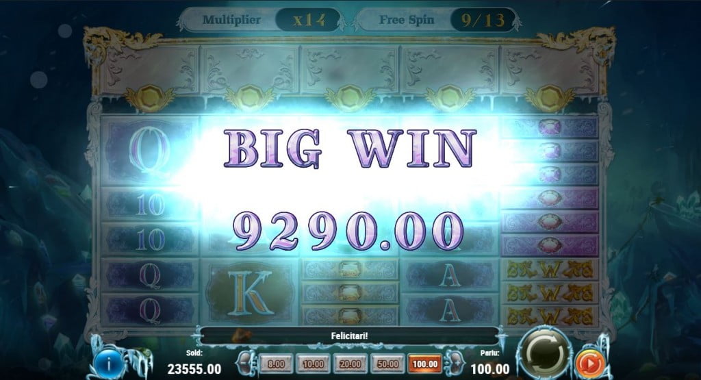 Tot ce am zis până aici e clar că aduce câștiguri bune. Dar poți avea și mega câștiguri la rotiri gratuite. Sunt numite Frozen Spins aici, și primești 9 rotiri când apar 3 Scatter-uri pe ecran. În timpul lor primești câte una suplimentară pentru fiecare Scatter care apare pe ecran. Câștigurile sunt URIAȘE aici pentru că multiplicatorul nu se resetează pe parcursul rundelor gratis. Fiecare plată crește valoarea lui cu 1, iar spre finalul rotirilor ajungi la un multiplicator de cel puțin x15. Multiplicator care-ți face orice câștig, cât de mic ar fi, să fie un big win. Iar unul mare devine câștig colosal.
