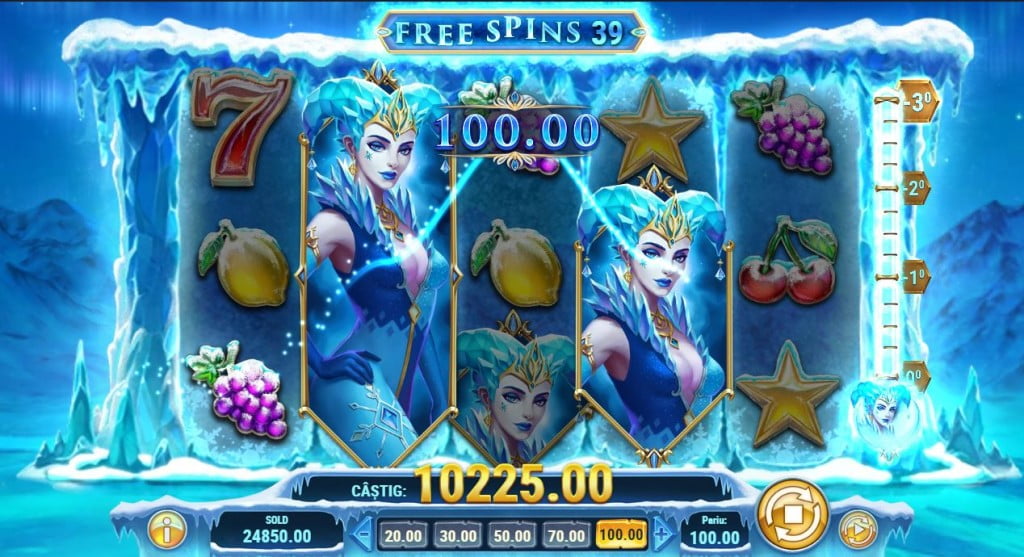 Câștiguri mari ai la rotirile gratuite. Sunt exact ca re-rotirile aduse de Ice Joker, doar că durează mult mai mult. La 3 Scatter-uri prinse mergi la roata norocului. Pe ea sunt numere, de la 2 la 7. Tu o învârți, iar numărul pe care îl nimerești indică numărul jokerilor pe care o să-i ai pe parcursul bonusului. Și intri la rotirile gratuite cu Ice Jokeri. Îl iei pe primul, rolele se învârt, iar dacă apar simboluri noi (inclusiv în re-rotiri) se prelungesc. În momentul în care nu mai ai niciun Ice Joker pe ecran vine unul dintre cei câștigați la roata norocului. Media pe care am avut-o eu la aparatul ăsta e de 10 rotiri gratuite pentru fiecare Ice Joker câștigat. O grămadă de bani, dragilor.