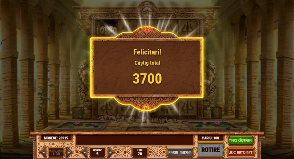 Statueta lui Vishnu e foarte simplu. Mergi într-un ecran unde apare Vishnu și, în fiecare dintre cele 6 mâini ține câte un bonus. Dai click pe mâini și suma din ele merge în contul tău. Dacă mâna e goală, bonusul ia sfârșit și rămâi cu banii deja câștigați.