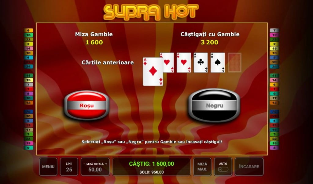 Dublajele sunt prezente, ca la toate jocurile de păcănele Novomatic. Simplu la ele, le știe toată lumea: după câștig poți încasa banii sau poți merge la Gamble, unde încerci să dublezi profitul. Alegi dacă asul care e cu spatele pe ecran e roșu sau negru. Dacă-l nimerești, ai de două ori mai mulți bani. Dacă nu, ai pierdut tot. Aici poți transforma câștigurile mari în câștiguri colosale, dar e important să știi și când e cazul să bagi în casă. Altfel, ajungi să pierzi orice mână că vrei să duci dublajul până la capăt. E greu.