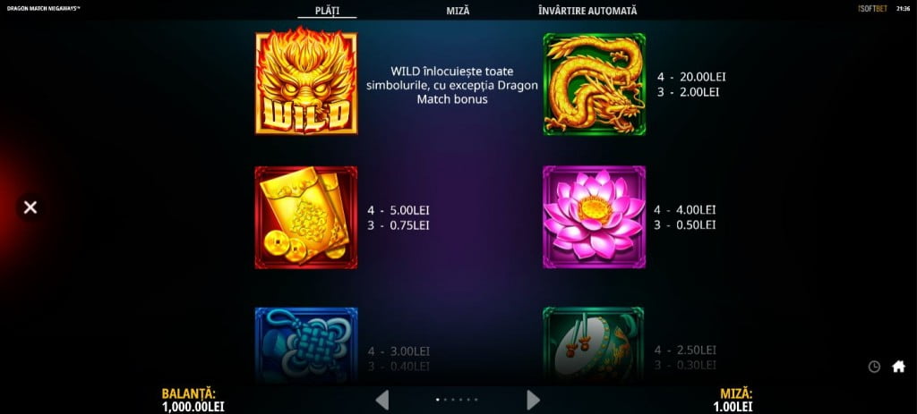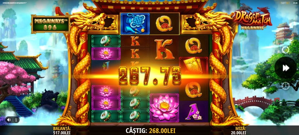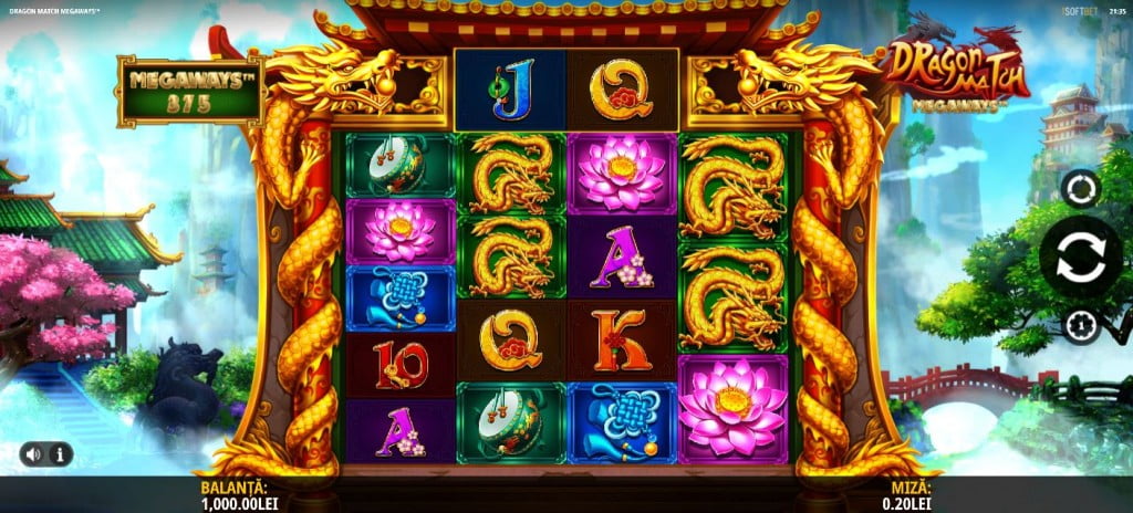 Dragon Match e cu influențe chinezești, centrat pe dragoni. Numele e dat de rândul de deasupra rolelor, unde câștigi rotirile gratuite dacă lipești cele două simboluri dragon. Muzică bună pe fundal, grafică DE TOP, simboluri super bine desenate și o grămadă de moduri de câștig. Valori bune la simboluri, multiplicator nelimitat la bonus, rotiri gratuite. Recomand.