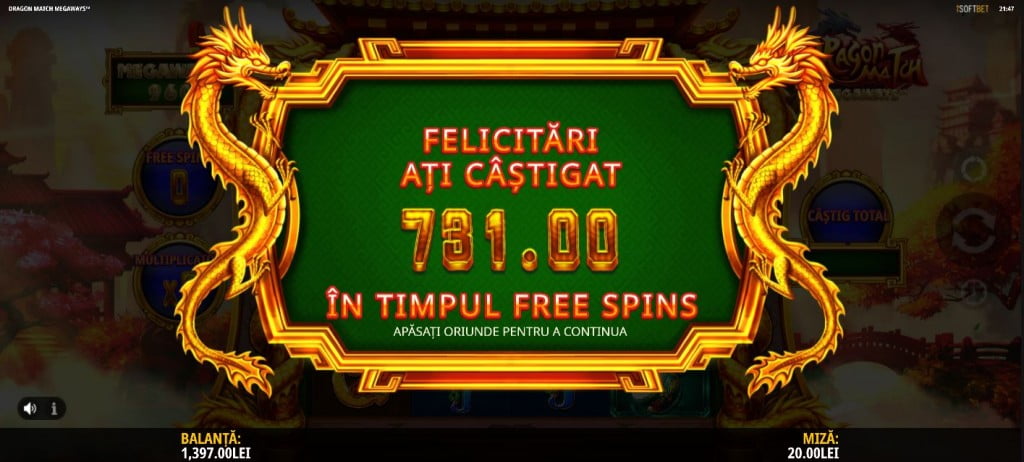 Câștigurile mari vin la rotirile gratuite. Le declanșezi când pe rândul de sus ai dragonul din două piese lipit. Primești 5 rotiri suplimentare dacă ai din nou dragonul pe linia de sus. Rotirile sunt cu multiplicator, dar tu alegi numărul lor. Poți alege între 12 care pornesc cu x1, 8 rotiri care pornesc cu x3, 5 rotiri și multiplicator de start x5. Sau varianta misterioasă, care poate da orice valoare (poți lua și 12 rotiri cu x5, dar și 5 rotiri cu x1). Recomandarea mea e clară: luați varianta cu 12 rotiri. Cam de fiecare dată ajung să am multiplier x5 după 2-3 rotiri gratuite, și ajung mai bine chiar decât la variantele celelalte. Alegerea misterioasă nu e a mea, că nu mă consider atât de norocoasă.