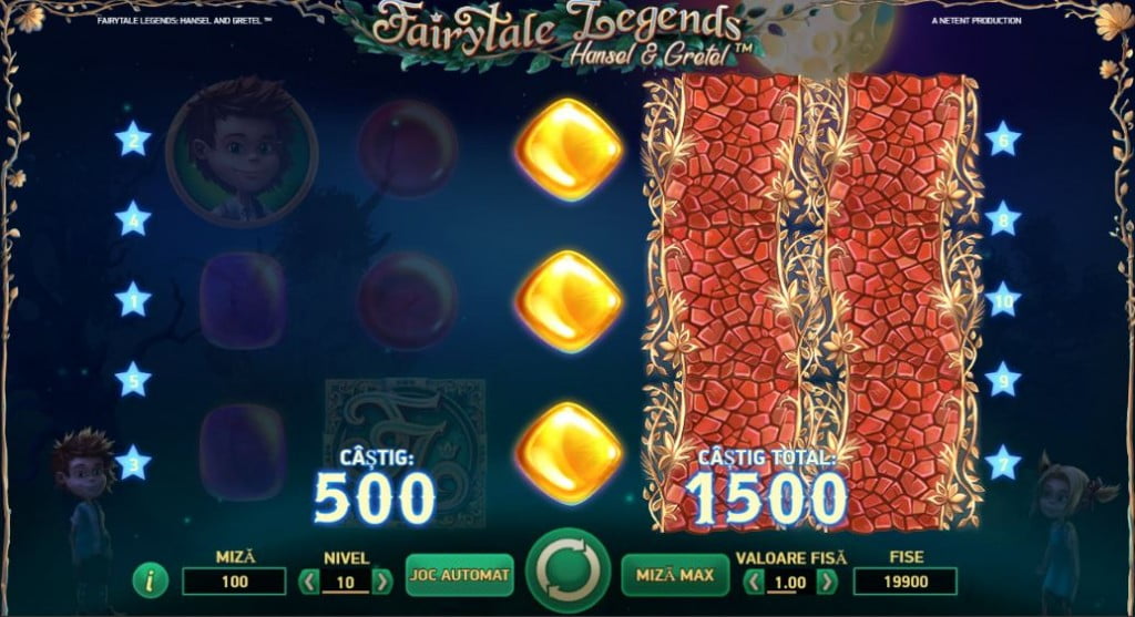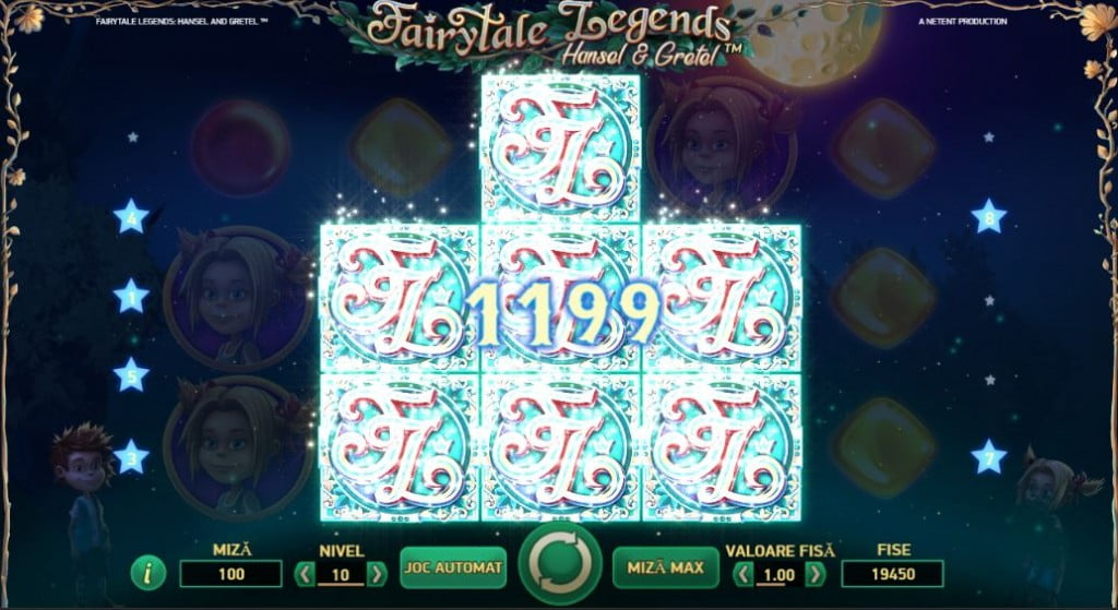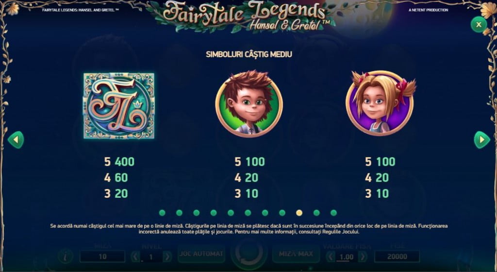 Miza x40 e adusă de sigla Fairytale Legends, cel mai mare simbol din joc. Plăți mari au și Hansel și Gretel, iar mici sunt la pietricelele în diferite culori: roșu, galben, verde, albastru.