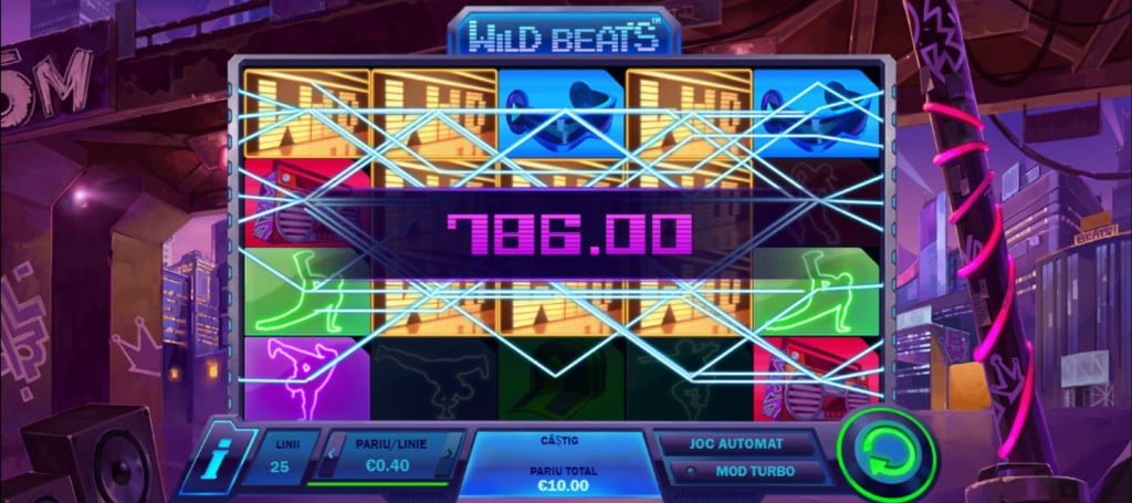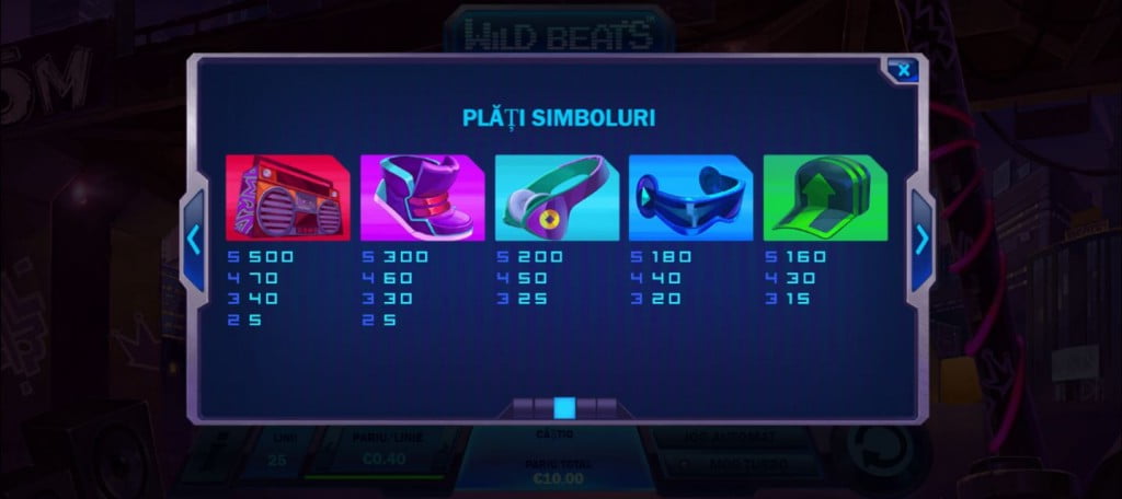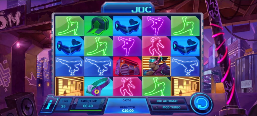 Casetofonul plătește miza x20, cel mai mult. Apoi sunt adidașii de dans, căștile, ochelarii și șapca. Simbolurile mici sunt cele cu mișcări de breakdance.