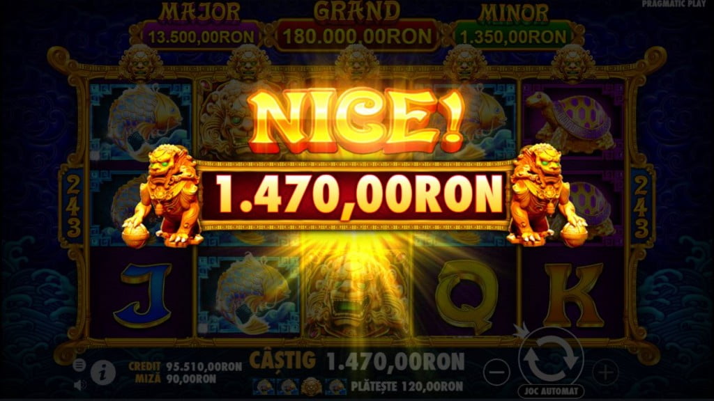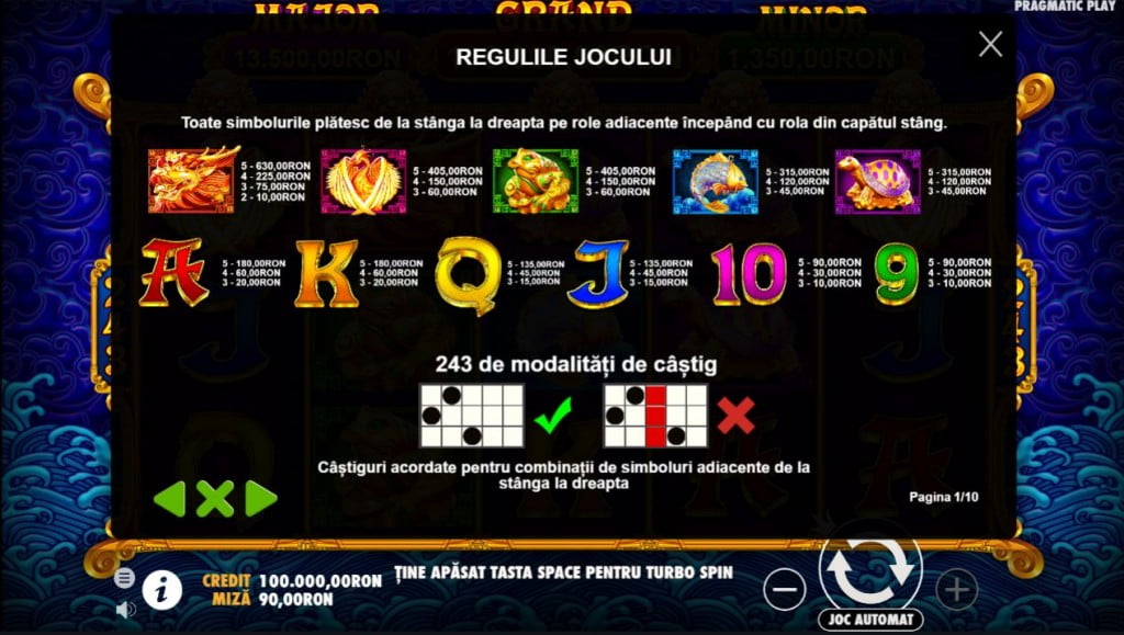 Dragonul plătește cel mai mult: miza x7 când apare de 5 ori pe ecran. Urmează pasărea phoenix, broasca, peștele și țestoasa. Simbolurile mici sunt cărțile de joc, de la 9 la A.