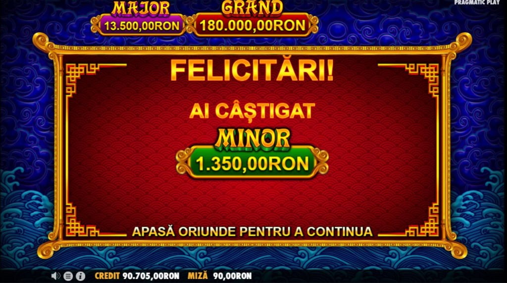 Premiul Caishen Aleatoriu se declanșează la întâmplare, în timpul jocului obișnuit, și te poate duce la rotirile gratuite fără să mai prinzi Scatter-urile necesare. Doar că te poate duce și la cel mai mare premiu din joc.