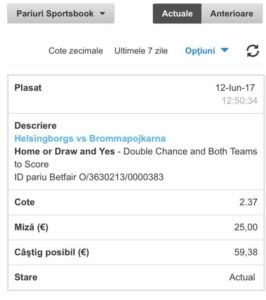 Cel de-al doilea pariu este plasat pe Betfair Sportsbook, acolo unde primești un bonus de 100 de Euro dacă te înregistrezi prin acest link și un cadou de 50 de Euro din partea Piatadeponturi.ro, constând în toolbox-ul Puterea Cotelor, scris chiar de mine.